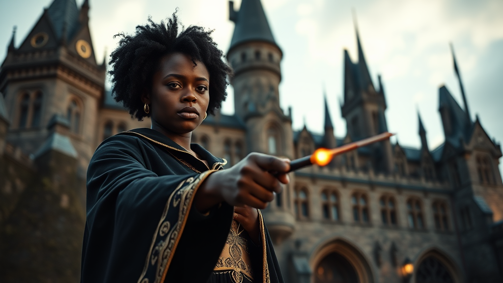 A determined 30-year-old African American woman stands confidently in front of the iconic Hogwarts School of Witchcraft and Wizardry, practicing the Dark Arts with her wand. The majestic castle serves as a stunning backdrop in this wide shot, while the woman, in the foreground, focuses intently on her wand work. She's dressed in an elegant black and gold Hogwarts robe, her hand aglow with magical energy. Her face is a picture of intensity and dedication, concentrating as she casts a powerful spell. She knows the importance of mastering her craft to defend her students from an impending threat. The cinematic scene, inspired by the Harry Potter universe and directed by Ryan Coogler, emphasizes her precise and graceful wand movements, revealing years of practice and discipline. The scene is set during the golden hour, with warm light highlighting the castle and woman's features. Muted colors, with a subtle blue and purple hue, create a magical ambiance. Her passion for magic and her fearlessness in facing the Dark Arts shine through every gesture. Hogwarts stands majestically, a testament to the rich history and tradition of the wizarding world, as she embodies the legacy of magic with unwavering dedication and focus.