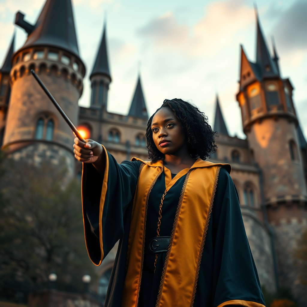 A determined 30-year-old African American woman stands confidently in front of the iconic Hogwarts School of Witchcraft and Wizardry, immersed in practicing the Dark Arts. Her black and gold Hogwarts robe flows majestically as she wields her wand with precision and grace, a testament to her years of discipline. A powerful glow envelops her wand hand, reflecting the intensity of her magical focus. The scene unfolds during the golden hour, casting a warm, ethereal light over the grand castle and the dedicated witch. Subtle hues of blue and purple in the sky heighten the magical atmosphere, enhancing the cinematic quality reminiscent of Ryan Coogler's visionary direction. Determination radiates from her, showcasing her readiness to protect her students from impending threats. Hogwarts' majestic presence stands as a reminder of the rich wizarding tradition she embodies, infusing every practiced spell with passion and commitment.