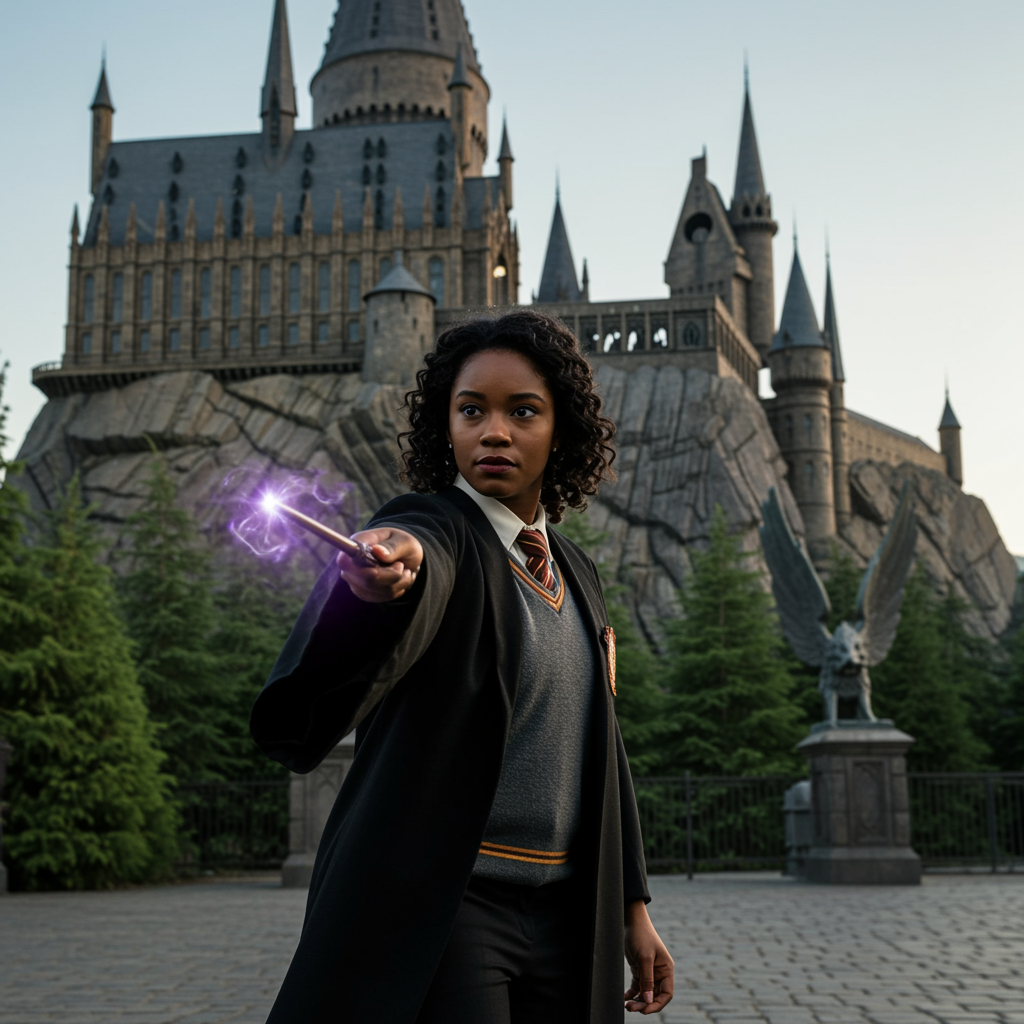 A determined 30-year-old African American woman stands in front of the majestic Hogwarts School of Witchcraft and Wizardry, her presence commanding as she practices the Dark Arts with her wand. Dressed in a sleek black and gold Hogwarts robe, she is poised, her wand hand glowing with powerful magical energy. Her expression is intense and focused, as if she's channeling all her might to perfect her spell-casting skills. The woman's wand movements are both precise and graceful, reflecting years of dedicated practice. The scene is set during the golden hour, bathing everything in a warm light, with muted colors tinged with hints of blue and purple adding a mystical ambiance. In the background, Hogwarts castle looms grandly, a symbol of the rich history and tradition of the wizarding world. The woman’s determination to master her spells is clear, driven by the need to protect her students from an impending threat. Her passion for magic is evident in every motion, as she faces the challenges of the Dark Arts unafraid.