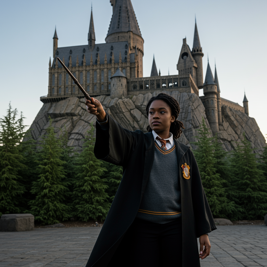 A determined 30-year-old African American woman stands confidently in front of the enchanting Hogwarts School of Witchcraft and Wizardry, mastering the Dark Arts with her wand. The majestic castle is beautifully captured in the background during the golden hour, casting a warm glow over the scene. Clad in an elegant black and gold Hogwarts robe, she raises her wand, radiating magical energy, as her intense gaze reflects her commitment to perfecting her spells. Her precise and graceful movements reveal years of practice and discipline, preparing her to protect her students from an impending threat. The muted tones with hints of blue and purple add to the magical atmosphere, highlighting the woman’s unwavering passion for magic. Her every motion speaks to her bravery and dedication, while the iconic Hogwarts castle stands tall, symbolizing the rich heritage of the wizarding world.