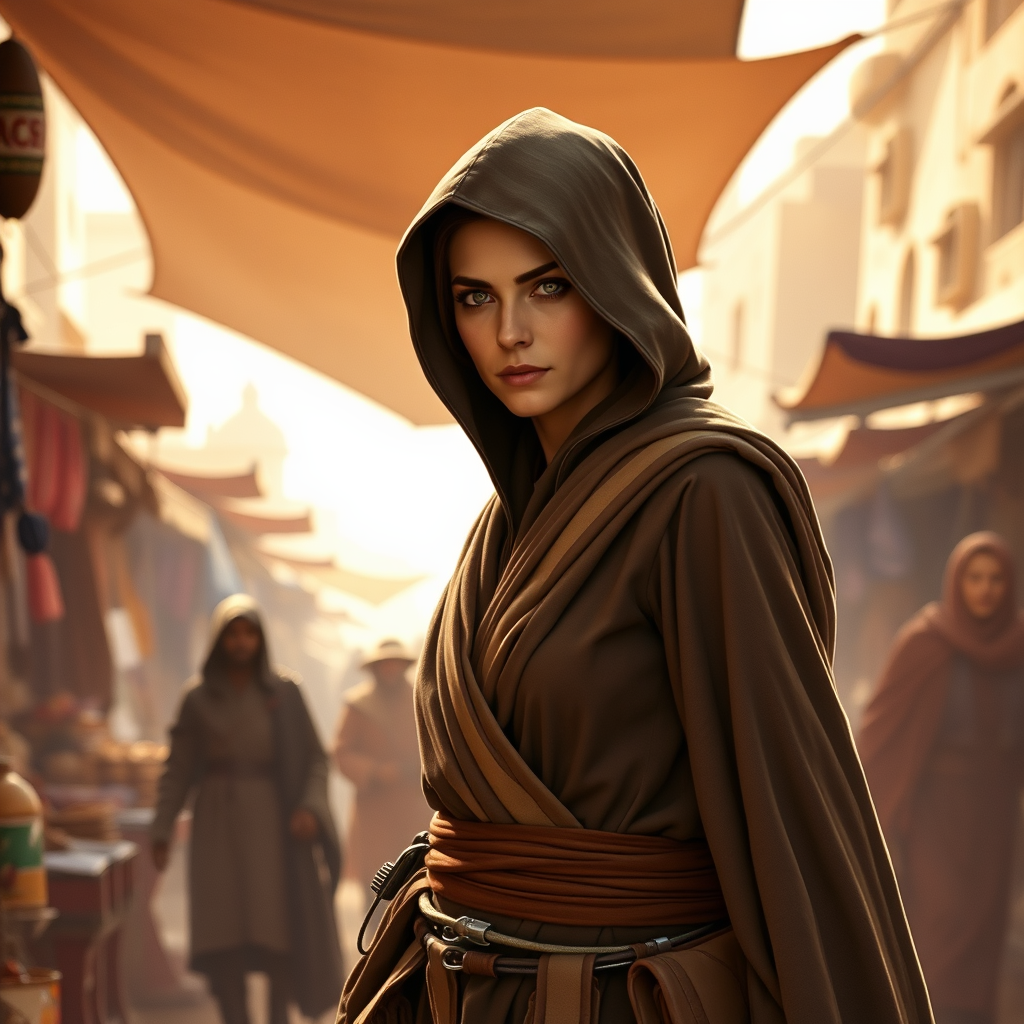 A determined and courageous female Jedi strides through a bustling market on Tatooine, her hooded robe casting subtle shadows over her face. The desert sun beats down, highlighting the resilience in her eyes as she navigates the vibrant chaos of merchants and traders. She moves with a graceful confidence, her presence commanding respect amidst the myriad of colorful stalls and exotic scents, blending seamlessly into the vibrant tapestry of life while maintaining an air of mystery and purpose.