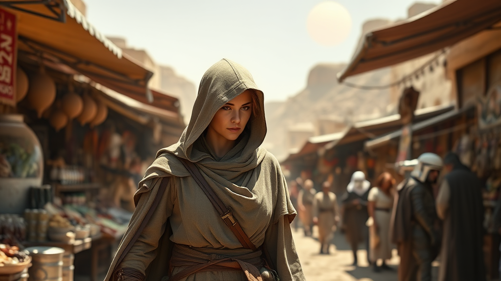 A determined and valiant female Jedi strides through a bustling market on Tatooine, her hooded cloak casting shadows over her focused eyes, as she navigates through stalls brimming with exotic goods and curious onlookers under the planet's twin suns.