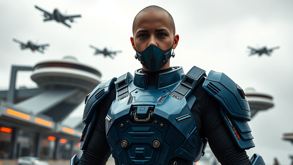 A determined, armored female figure stands confidently in a sleek blue sci-fi spacesuit on a bustling spaceport. Behind her, futuristic flying platforms zip through an overcast sky. Her visage, enhanced by a sci-fi visor and intricate respirator, is set with purpose, emphasizing her bald head and the gleam of her plate armor. The third-person perspective from below adds drama and reverence to her presence. Every detail is captured with precision, reminiscent of a cinematic production, featuring natural textures, and light that dances with moodiness across the scene. The environment is rendered with photorealism, using cutting-edge ray tracing techniques. The image showcases an ultra-HD quality with an 8K resolution, invoking a cinematic aura through long exposure blur effects and natural ambient lighting, creating a scene that's both immersive and breathtaking.