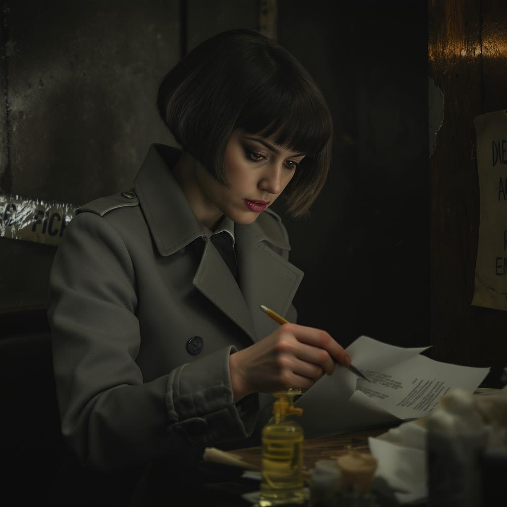 A determined female detective with a sharp bob haircut and keen brown eyes, donning a tailored gray trench coat, meticulously investigates evidence in a shadowy crime scene. The composition is a half-body portrait rendered in the distinctive style of Wes Anderson, featuring intricate details. The background exudes a gritty atmosphere, enhancing the expressive and cinematic quality of the scene.