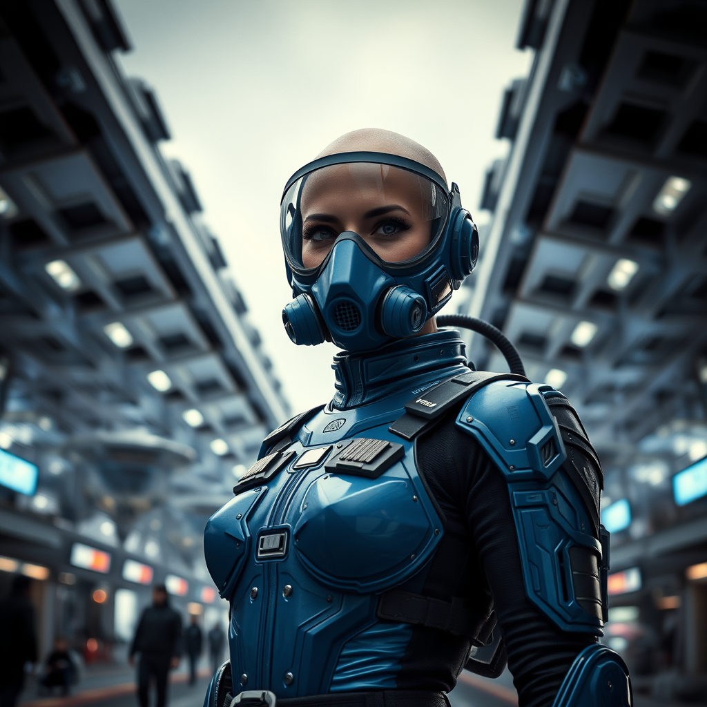 A determined female figure stands confidently in a sleek, blue sci-fi spacesuit, her appearance enhanced by sci-fi accessories like a visor, lens, and respirator, casting an air of mystery. The scene takes place on a bustling spaceport filled with futuristic flying platforms, the overcast sky adding drama. Her bald head is protected by intricate plate armor, while the isolated armor details add a touch of modern elegance. Captured in a third-person view from below, the image is rich with fine detail reminiscent of a sci-fi movie, blending photorealism and cinematic aesthetics. The natural textures and light create a moody ambiance, with cinematic lighting and ray tracing elevating the realism to an ultra-HD level. The scene features subtle blur effects and long exposure highlights to emphasize movement and depth, presented in a stunning 8K resolution that captures every intricate detail.