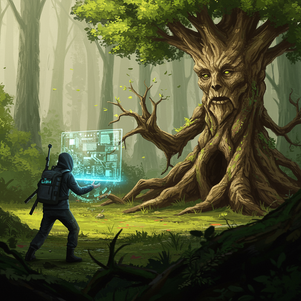 A determined hacker engaged in a digital battle against an ancient, sentient tree, both wielding their unique powers in a clash of technology and nature, set in a dense, otherworldly forest.