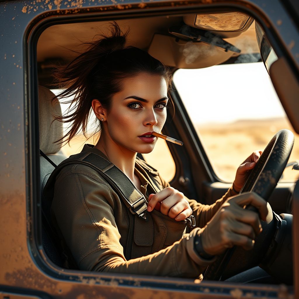 A determined woman clad in tactical gear sits behind the wheel of a rugged jeep, her eyes focused and intense. A thin trail of smoke spirals from the cigarette she holds effortlessly between her lips, as the engine purrs beneath her. Her hair, tied back with precision, flutters gently with the breeze through the open window, revealing a face of experience and resolve. The sun casts a warm glow over the desert landscape, highlighting the dust on the jeep's exterior and the grit of the woman within.