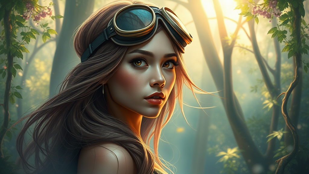 A determined woman with aviator goggles resting on her head, standing in a lush, mystical forest, by Rudy Siswanto, fantasy art, realism, vibrant colors, intricate details, ethereal light filtering through the trees, a gentle breeze rustling the leaves, her flowing hair blending with nature, expression of curiosity and courage, surrounded by soft, shimmering magical elements, creating a harmonious blend of reality and fantasy.