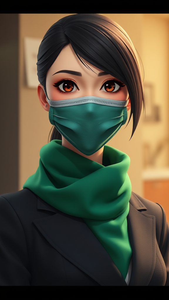 A determined woman with sleek black hair wearing a dark blazer and a vibrant emerald scarf, a cloth face mask concealing her expression, captured in anime 3D style, rendered in ultra-high-definition 8K using Unreal Engine, showcasing an artistic flair with a focus on expressive elements and a vertical aspect ratio of 9:16.