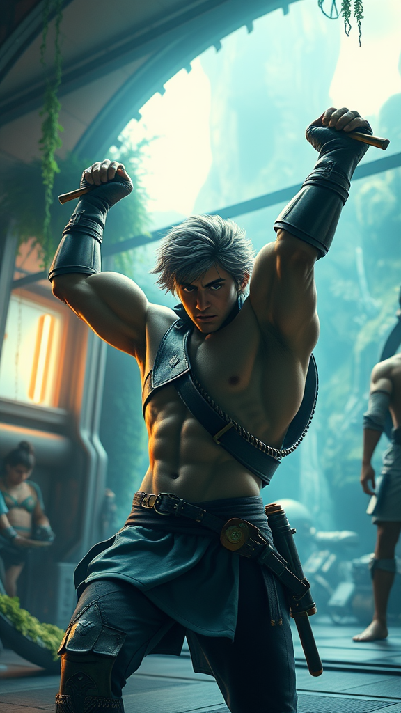 A determined young man with a muscular build, immersing himself in intense training at a futuristic gym, reminiscent of Miyazaki's vibrant creativity. The scene captures the essence of Nausicaa's adventurous spirit and the expansive landscapes of Breath of The Wild. The composition is epic, with a dynamic atmosphere that blends lush, nature-inspired elements and advanced technology, highlighting the harmony between strength and serenity. Soft, ethereal lighting casts gentle shadows, and the environment is rich with intricate details, creating a sense of wonder and aspiration.