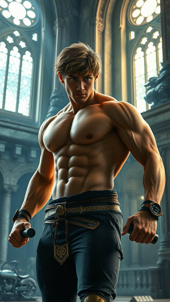 A determined young man with a muscular build, immersed in an ancient, mystical gym setting reminiscent of Miyazaki's ethereal landscapes, where nature and technology intertwine. His intense focus mirrors the adventurous spirit of Nausicaa and the sweeping majesty of Breath of the Wild, surrounded by ethereal light filtering through vast, towering windows. The scene exudes an epic composition with mythical creatures carved into the stone walls, as he performs a dynamic workout, forging strength and willpower amidst an environment that blends the past and future, evoking a world of fantasy and resilience.