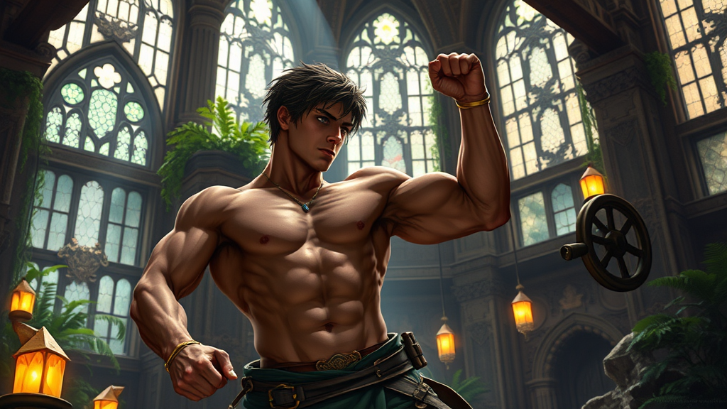 A determined young man with a powerful physique, training vigorously in a mystical gym, inspired by the art of Miyazaki and the world of Nausicaa and Breath of The Wild. The scene is set with an epic composition, blending nature and fantasy elements as ethereal sunlight filters through high windows, casting a magical glow on ancient, fantastical equipment. Lush greenery and softly glowing stones reminiscent of an enchanted forest surround him, infusing the atmosphere with a sense of wonder and adventure.