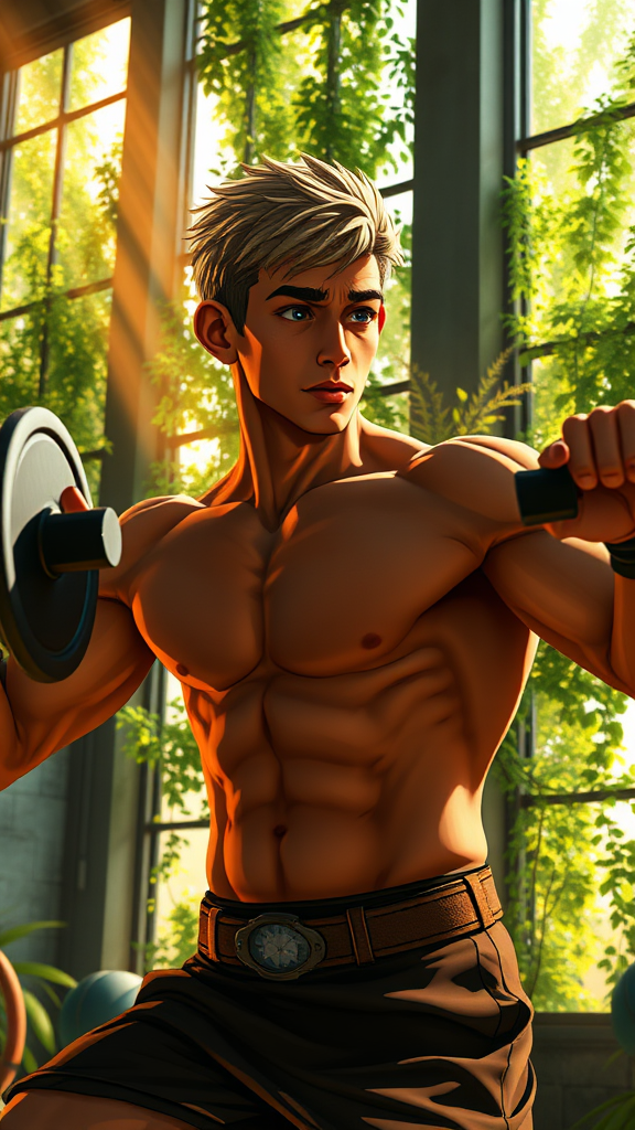 A determined young man with an aura of strength and vitality engages in an intense workout session. The scene, inspired by the vivid artistry of Miyazaki, Nausicaa Ghibli, and Breath of The Wild, captures the essence of an epic journey. The gym setting is a blend of futuristic design and natural elements, with shafts of warm, golden sunlight streaming through tall windows adorned with lush greenery. The young man's focused expression and dynamic movements are highlighted by vibrant colors and fluid lines, creating a sense of motion and energy. The composition is grand and cinematic, with a harmonious balance of strength and serenity, reminiscent of an adventure-ready hero honing his skills for the challenges that lie ahead.