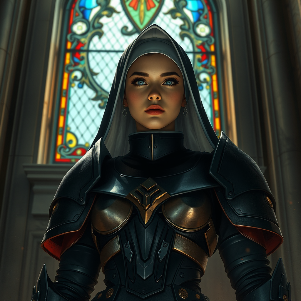 A devout Sister of Battle stands resolute, poised in an action scene before a stunning stained-glass window. Her detailed, symmetrical face exudes beauty, with reflective eyes, dark eyebrows, and artful makeup. Clad in a striking sci-fi nun-like armor, she embodies the Warhammer 40k aesthetic. Marble walls surround her, illuminated by dramatic chiaroscuro lighting that highlights dust particles in the air. The scene is captured from above, reminiscent of a majestic oil painting by masters like Waterhouse, John Constable, and Jeremy Mann. This intricate, high-detail artwork is suffused with emotional depth and a touch of impressionism. It draws influence from Studio Ghibli, Atey Ghailan, and Makoto Shinkai, trending on platforms like ArtStation and CGSociety.