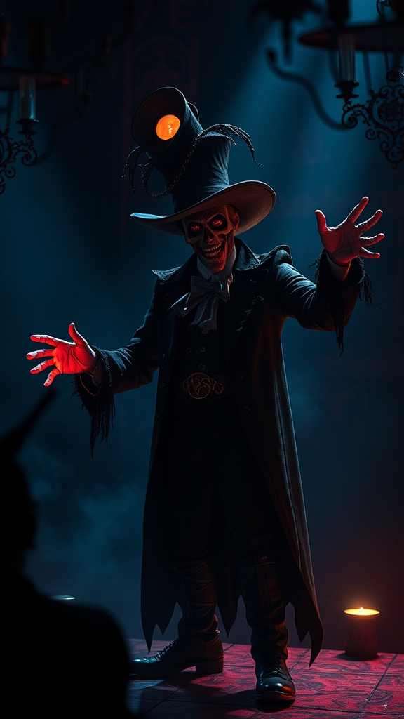 A diabolical and unhinged master showman orchestrates a nightmarish carnival of shadows, leading a macabre and eerie circus show filled with twisted allure and sinister charm, shrouded in darkness. The scene is replete with elaborate designs and intricate details, casting long, dramatic shadows through striking, cinematic lighting. The atmosphere is suffused with a haunting realism, captured in stunning 8k resolution, immersing viewers in a spectacle where every sinister curve and grotesque figure is vividly brought to life.