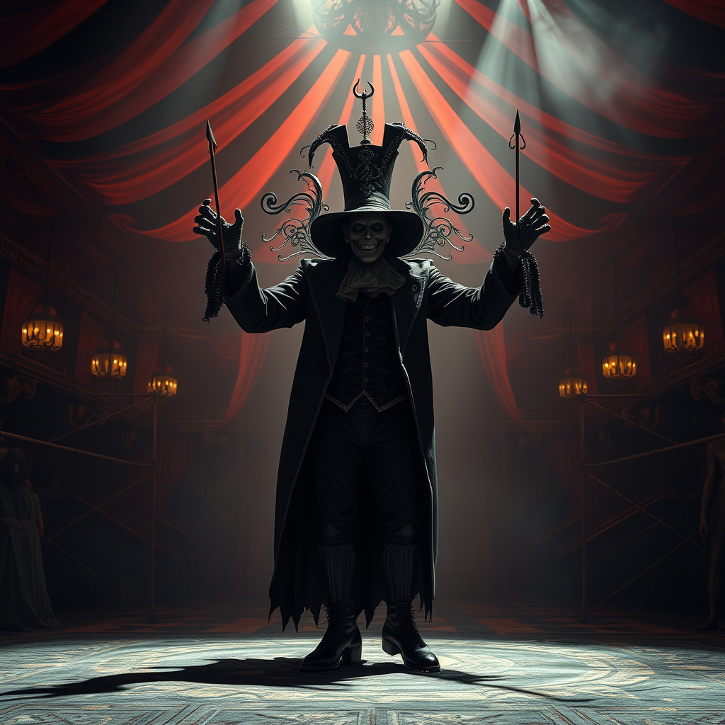 A diabolical, twisted master showman orchestrates a grotesque and eerie circus performance, enveloped in an atmosphere of horror and shadow. The circus is saturated with intricate designs and elaborate details, creating a hauntingly mesmerizing spectacle. The dramatic, moody lighting casts long, sinister shadows across the photorealistic scene, capturing every macabre element in cinematic 8k resolution, presented in a 9:16 aspect ratio.