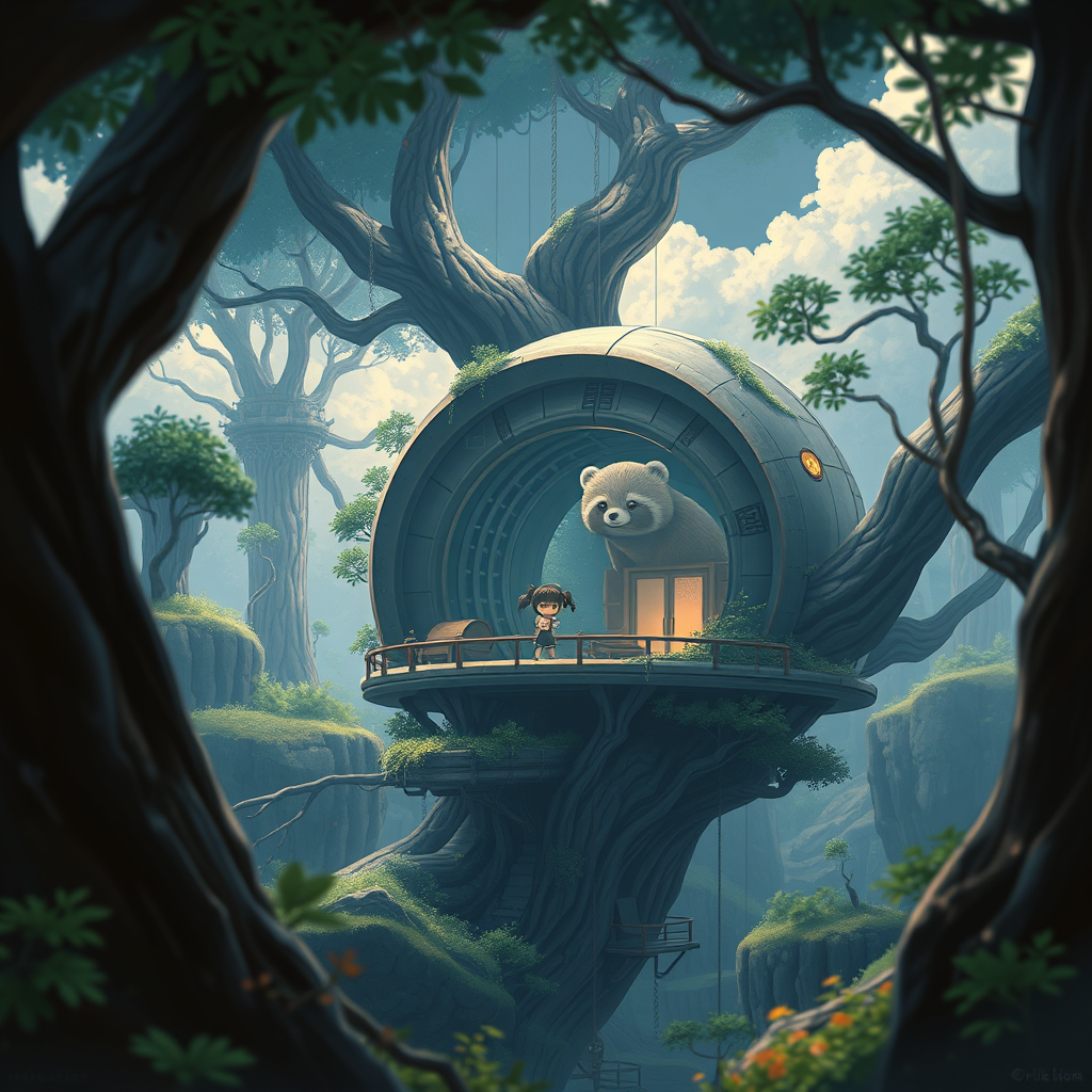 A digital 2D artwork in the style of Miyazaki, featuring an intricately detailed, futuristic and magical dreamy landscape. A small, cute girl resides alone with her large, plush-like friendly tanuki companion amidst a gigantically wild setting. The scene showcases an intricate, multilayered round futuristic architecture, designed as a tree-top habitation cabin. The lighting is dramatic and soft, employing the rule of thirds for a cinematic effect. With tiny, finest details woven into the scenery, this vision captures the harmonious blend of sci-fi elements with a mystical atmosphere, subtly modified to highlight the serene coexistence of nature and advanced technology.