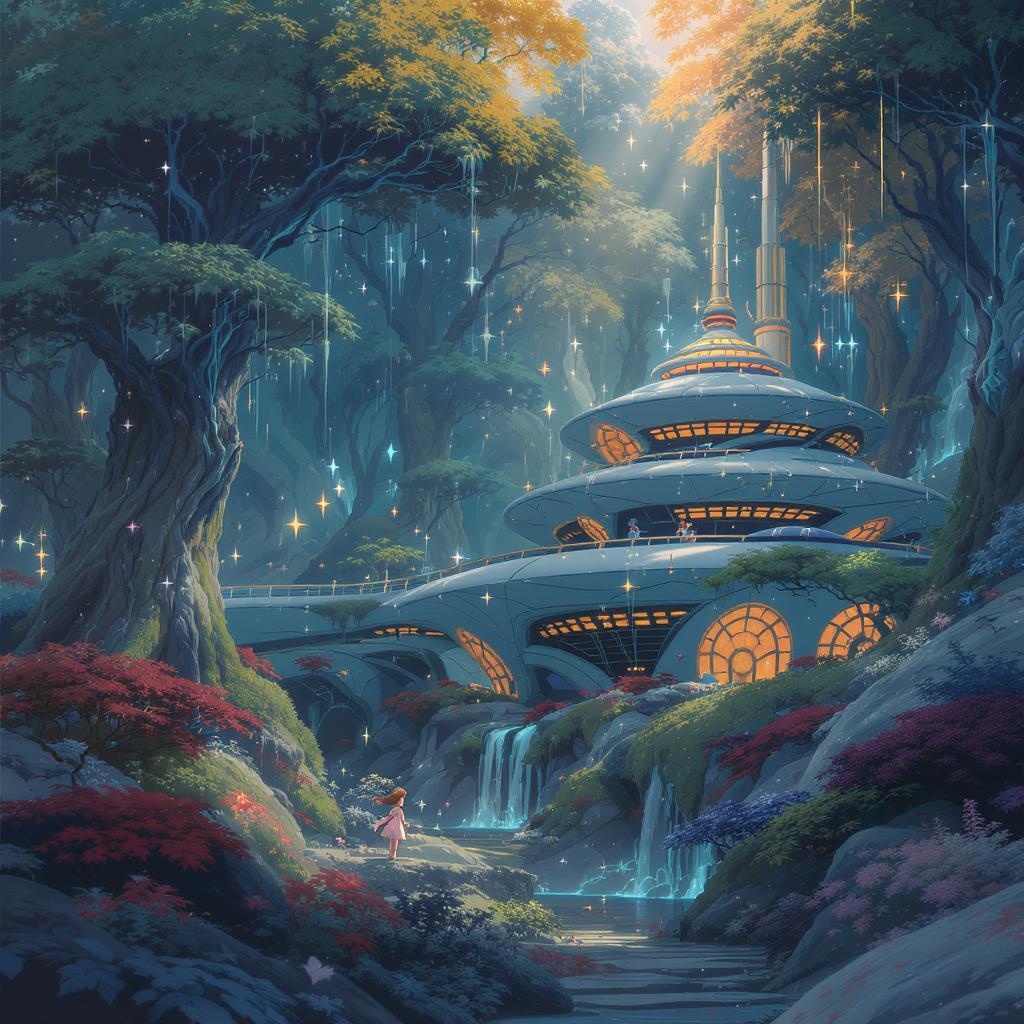 A digital 2D scene inspired by Miyazaki's iconic style, featuring a fantastically detailed, futuristic, and magical dreamy landscape. The setting is a sprawling wilderness where a small, cute girl lives alone, surrounded by immense natural beauty. Her home is a round, futuristic, multilayered architectural marvel nestled among the trees, characterized by intricate, whimsical designs. The forest is a tapestry of lush foliage, illuminated by dramatic, soft lighting that casts enchanting shadows. The composition follows the rule of thirds, evoking a cinematic quality filled with mystery and wonder. Small creative elements include ethereal glowing flora and fauna that add a mystical ambiance to the vibrant scenery.