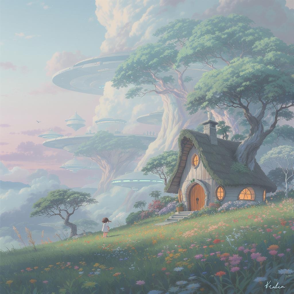 A digital 2D scene inspired by Miyazaki's style, showcasing an intricately detailed, magical, and futuristic landscape. A small, cute girl lives harmoniously within a vast, enchanting wilderness, featuring round, multi-layered futuristic architecture. Her abode is an intricately designed cabin nestled among towering trees, blending seamlessly with nature. The setting is bathed in dramatic, soft lighting, creating a dreamy ambiance. The composition follows the rule of thirds, providing a cinematic view of this captivating scenery. Elements of sci-fi and fantasy intertwine, giving life to an otherworldly yet inviting environment.