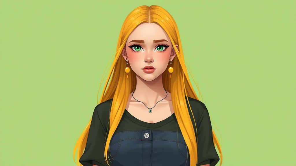 A digital art character portrait of a 20-year-old woman with long, straight sunburst yellow hair. She is depicted in a highly detailed and beautiful artwork illustration with an almond green background. She is wearing a dark banana yellow shirt and jeans, complemented by dark emerald green eyes. Her accessories include golden earrings and a simple silver necklace. The character has an air of maturity and a subtly gained weight, giving her a natural appearance. Her expression is slightly embarrassed. The illustration captures a clean and simple clothing design.