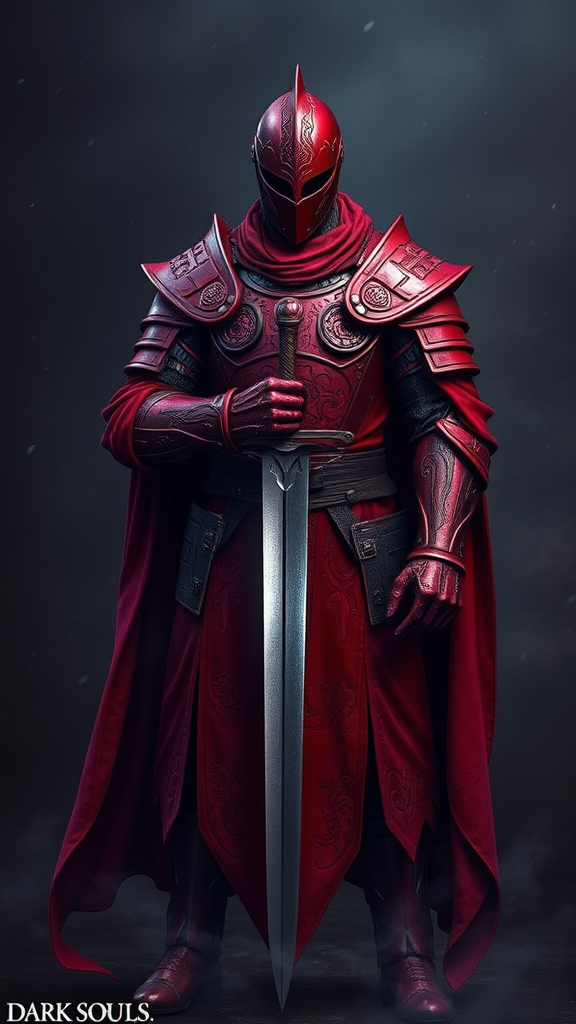 A digital art creation depicting a resolute medieval knight standing with a one-handed sword poised confidently in front of him, clad in exquisitely detailed red and purple armor that gleams with intricate engravings, crafted in a hyper-realistic digital style reminiscent of Dark Souls, the knight is set against a somber medieval backdrop exuding a darkcore ambiance, rendered in stunning 8k resolution with cinematic depth, capturing the essence of a haunting yet majestic warrior enveloped in an aura of mystery and strength, the scene subtly embellished with ethereal wisps of fog swirling around his feet, adding an atmospheric touch to the knight's imposing presence.
