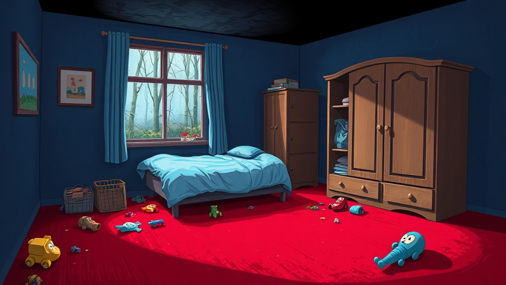 A digital art depiction of a bedroom featuring deep red carpeting and softly worn blue walls contrasted by a shadowy black ceiling. In one corner, a cozy bed covered with a sky-blue duvet rests beside a window showcasing a rainy forest scene outside. The room is cluttered, with toys scattered haphazardly across the floor, adding to the chaos. A half-open wardrobe stands next to the bed, its contents slightly spilling out. Despite the room's overall darkness, the vibrant cartoon style creates a whimsical atmosphere, infusing warmth and character into the space.