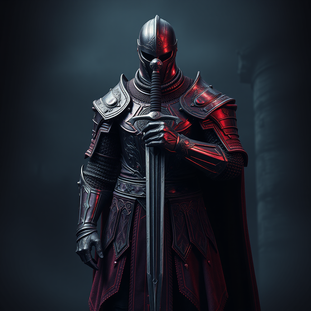 A digital art depiction of a formidable medieval knight standing poised with a one-handed sword held confidently before him. The intricately designed armor is strikingly detailed in hues of deep red and rich purple, shimmering with hyper-realistic textures that evoke the immersive style of Dark Souls. Set against a moody, shadow-laden medieval backdrop, the scene is enveloped in a darkcore ambiance, creating a hauntingly atmospheric setting. The composition is envisioned as a stunning 4k wallpaper, with cinematic elements that enhance its captivating allure. The armor glints with an intricate interplay of light and shadow, hinting at battles fought and victories won, capturing the viewer's imagination in a world where darkness and valor intertwine.