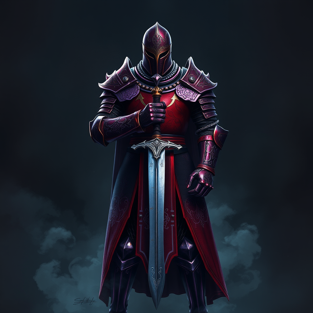 A digital art drawing of a medieval knight standing boldly with a one-handed sword held in front, donned in intricately designed red and purple armor that glimmers with hyper-realistic detail. The atmosphere is reminiscent of Dark Souls, with an eerie, dark medieval background shrouding the scene in a shadowy ambiance. The armor showcases exquisite craftsmanship, with ornate patterns and a gothic aesthetic. This image is crafted in a cinematic style, suitable for a 4k or 8k wallpaper, capturing the essence of darkcore with subtle mystical elements, like wisps of fog curling around the knight's feet, adding depth and intrigue to the composition.