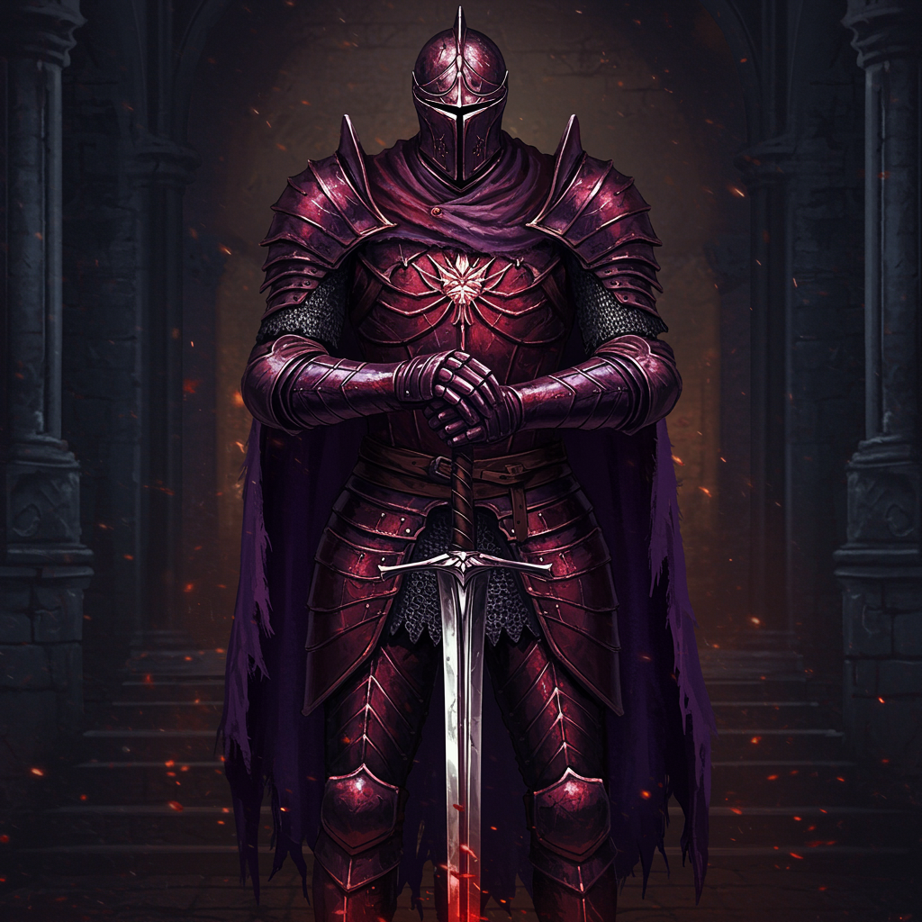 A digital art drawing of a medieval knight standing confidently, wielding a one handed sword in front of him. The knight's armor is an intricate blend of crimson red and deep purple, showcasing a stunning level of detail and craftsmanship. The style reflects digital realism, with hyper-detailed plating and ornate designs reminiscent of Dark Souls aesthetics. Set against a dark medieval backdrop, the atmosphere is brooding and immersive, exuding darkcore vibes. The image is crafted as a 4k wallpaper, enhanced to 8k resolution, providing a cinematic and highly detailed visual experience. Subtle variations in armor texture and background nuances add unique depth to the scene.
