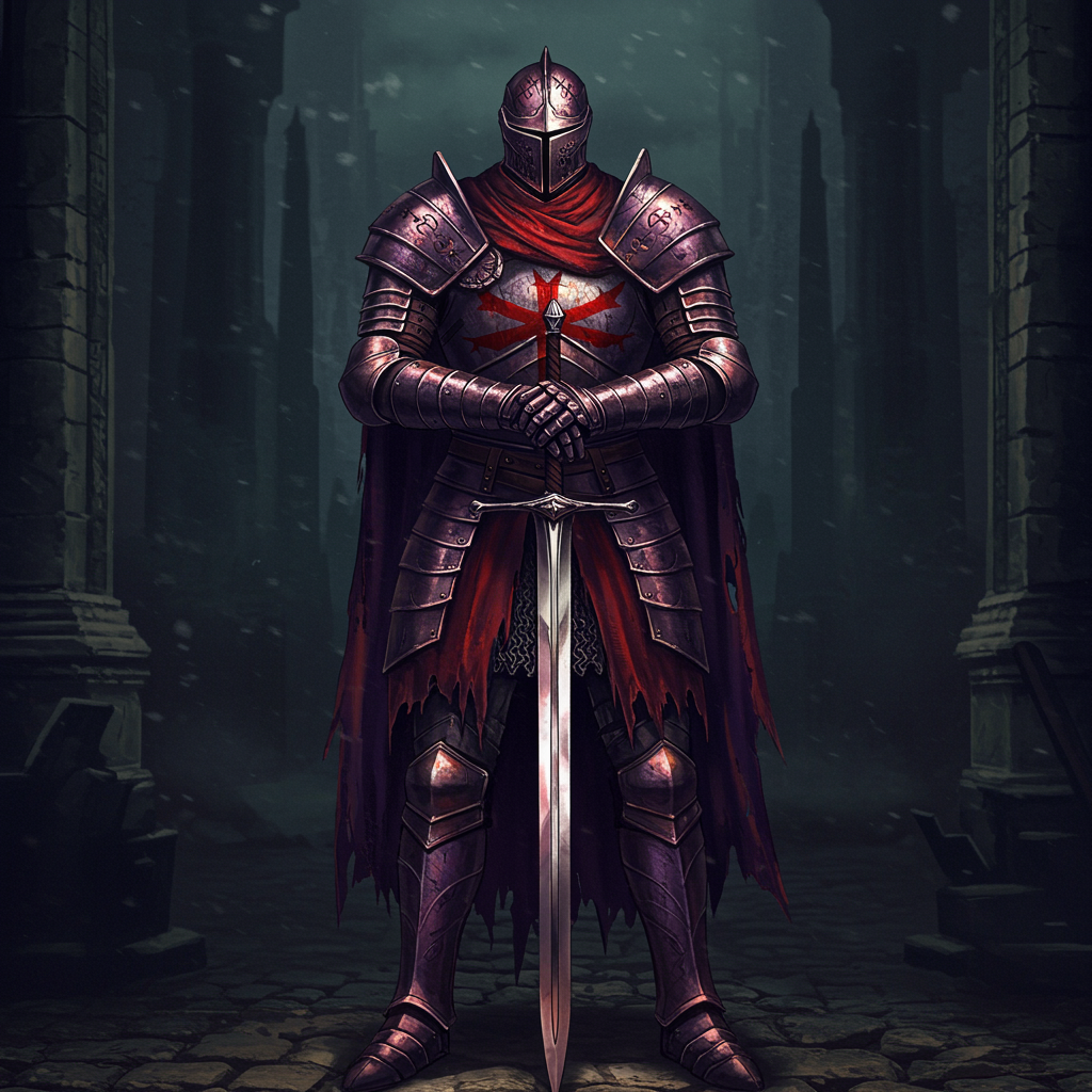 A digital art drawing of an imposing medieval knight standing resolutely with a one-handed sword held confidently in front of him, clad in meticulously crafted armor with intricate red and purple detailing, the metal glistening under a faint, eerie light. The style reflects digital realism, capturing the hyper-detailed craftsmanship akin to the Dark Souls aesthetic. The background is a shadowy, darkcore medieval setting, with looming stone structures and a somber atmosphere that emphasizes the knight’s formidable presence. The scene is rendered in striking 8k resolution for a cinematic feel, capturing every nuance of light reflecting off the armor's surface. The knight's pose is one of vigilant readiness, with subtle creative elements such as an ornate helm featuring a crest of ancient symbols, adding to the mystique of the character.