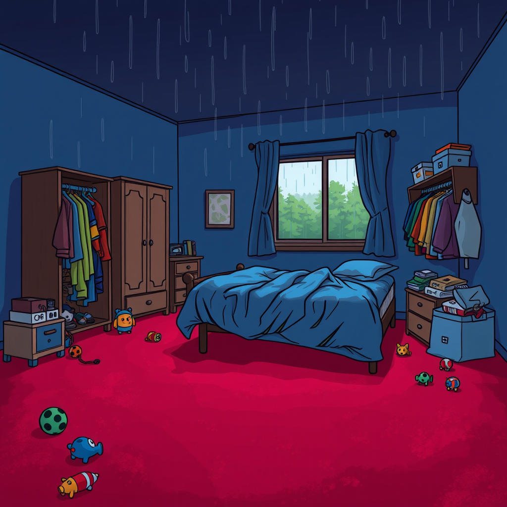A digital art piece depicting a cartoon-style bedroom with a deep red carpet spreading across the floor, contrasted by faded blue walls and a ceiling as dark as midnight. In the cozy corner of the room rests a bed, draped in a rumpled blue duvet that mirrors the hues of an overcast sky. Beside the bed, a window reveals a rainy afternoon with lush green forests softly obscured by the falling rain. The room is whimsically cluttered with a variety of toys sprinkled across the floor, each telling its own tale of play. A half-open wardrobe brimming with colorful garments stands sentinel next to the bed. Despite the overall cozy chaos and the palette of somber colors, the room radiates an inviting warmth, as if beckoning the viewer to step inside and embrace its snug, disheveled charm.