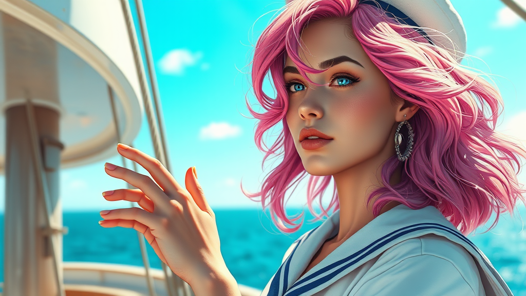 A digital art piece featuring a female sailor aboard a ship, reveling in the fresh sea breeze. Her medium wavy pink hair gently sweeps across her serene face under the bright sunshine. Inspired by Terese Nielsen, the artwork delivers a volumetric atmosphere with sharp focus and best quality, capturing her beautiful features and graceful hands. The high-resolution image is vibrant and intricately detailed, showcasing breathtaking, precise linework. Cinematic and comprehensive in its presentation, the image boasts maximum detail in 4k UHD, reminiscent of award-winning art and trending styles on ArtStation. This vivid scene does not include extra limbs, artifacts, or any poorly drawn elements, instead focusing on the flawless anatomy and expressiveness of the subject. There are no added objects or text, allowing the visual story to unfold purely through the artist’s detailed and captivating imagery.