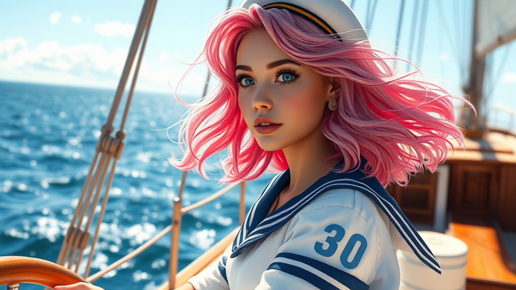 A digital art piece showcasing a female sailor aboard a sailing vessel, basking in the refreshing sea breeze. She has medium-length wavy pink hair that dances in the sunlight, with a beautifully expressive face and delicate, graceful hands. The scene is set in a vibrant, volumetric atmosphere that captures every intricate detail with sharp focus. The artwork is insanely detailed and breathtaking, reminiscent of the style of Terese Nielsen. Rendered in high resolution, it conveys a comprehensive cinematic quality with precise lineart and maximum detail, creating an awe-inspiring 4k UHD visual experience. This masterpiece exudes beauty and artistic excellence, delivering an award-winning depiction without any distracting elements like text, watermarks, or unnecessary distortions.