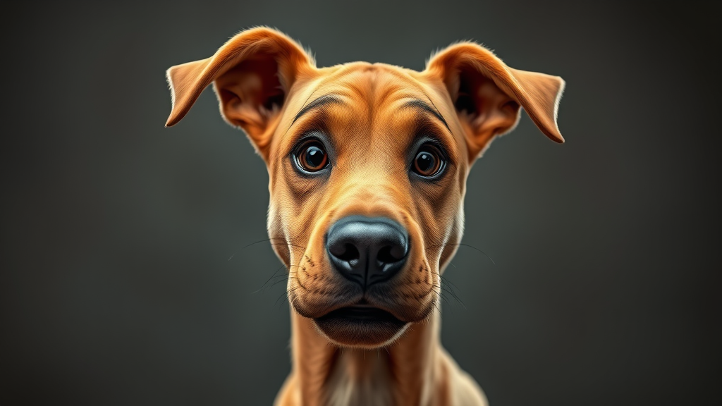 A digital art portrait of a light brown dog reminiscent of Scooby Doo, portrayed with ultra detailed features and sharp focus, set against a backdrop of dynamic lighting. The single subject is depicted with subtle creative modifications, maintaining the essence of the beloved character. The post-processed image captures the expressive eyes and playful demeanor, accentuating the unique charm and characteristics of the iconic cartoon dog in a fresh and imaginative way.