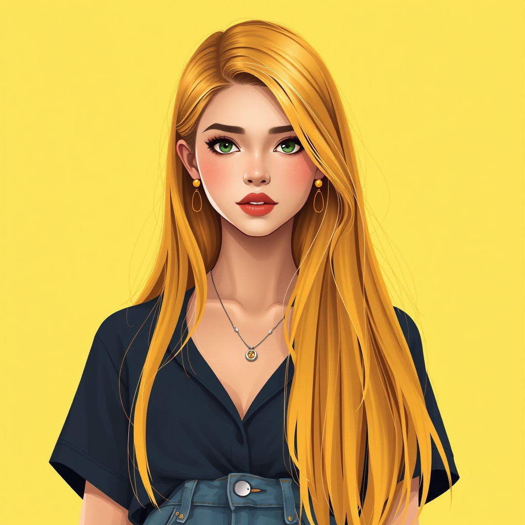 A digital art portrait of a young woman, featuring a beautiful illustration of a 20-year-old with long, straight sunburst yellow hair. Her upper body is shown against an almond green background, wearing a dark banana yellow shirt and simple jeans. She has dark emerald green eyes, a touch of maturity, and subtle weight gain, adorned with golden earrings and a simple silver necklace. The artwork is highly detailed, maintaining a seamless blend of colors and textures, and captures an air of elegance and creativity. A unique twist includes a hint of geometry and abstract elements, highlighting artistic flair, while keeping the portrayal realistic and tasteful.