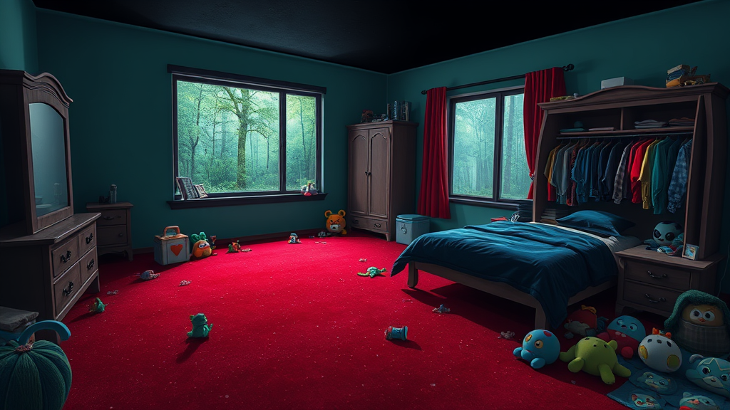 A digital art scene of a bedroom featuring deep crimson carpeting, walls of muted teal, and an inky black ceiling. In the far corner, a cozy bed draped with a navy blue duvet sits adjacent to a large window, revealing a lush forest obscured by rain. The room exudes a whimsical disorder with an assortment of colorful toys strewn across the floor and an ajar wardrobe teeming with clothes. The ambient light is dim, casting long shadows, enhancing the room's mysterious cartoon-like essence.