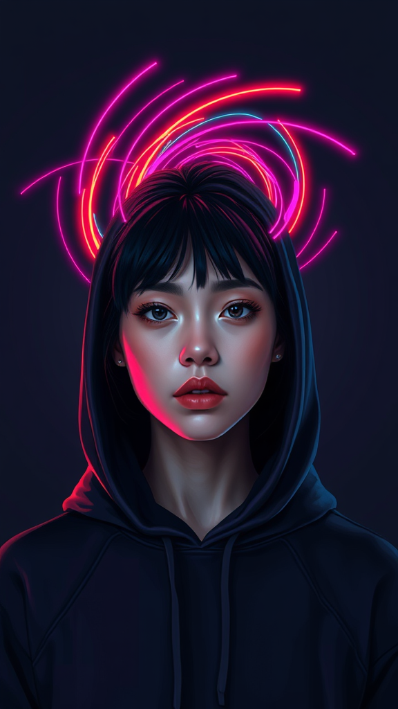 A digital artwork features a close-up portrait of a female figure, depicted in a digital flat color style. The composition presents a straight-on view, focusing on her upper body and face. She wears a dark-colored hoodie, serving as a backdrop to an abstract whirl emanating from her head. Neon-colored streaks radiate in various directions, contrasting decisively against a plain, dark background, enhancing her visibility. Her face is minimalistic, almost subdued, allowing for the abstract neon design to take the forefront. The artwork uses bright colors and contrasting shadows, emphasizing the vivid streaks and creating a sharp distinction between the subject and background, with occasional subtle glows reflecting off her hoodie.