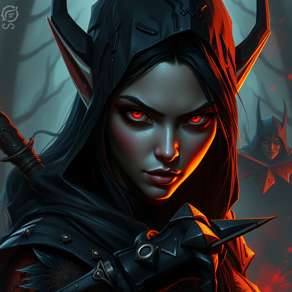 A digital artwork featuring a female elf assassin with dark skin and piercing red eyes. Her expression is one of intense focus, capturing her enigmatic and stealthy nature. The piece is highly detailed, reminiscent of styles by Dan Mumford, Peter Mohrbacher, and Greg Rutkowski. A fantasy character set against a mystical backdrop, the illustration is rendered in vibrant HDR and 4k resolution, showcasing intricate textures and patterns in her clothing and weaponry. The scene exudes a sense of mystery and danger, making it a standout piece on art platforms like ArtStation. The quality of the artwork is exceptional, combining a high-resolution finish with artistic flair, while creatively diverging from typical fantasy art tropes.
