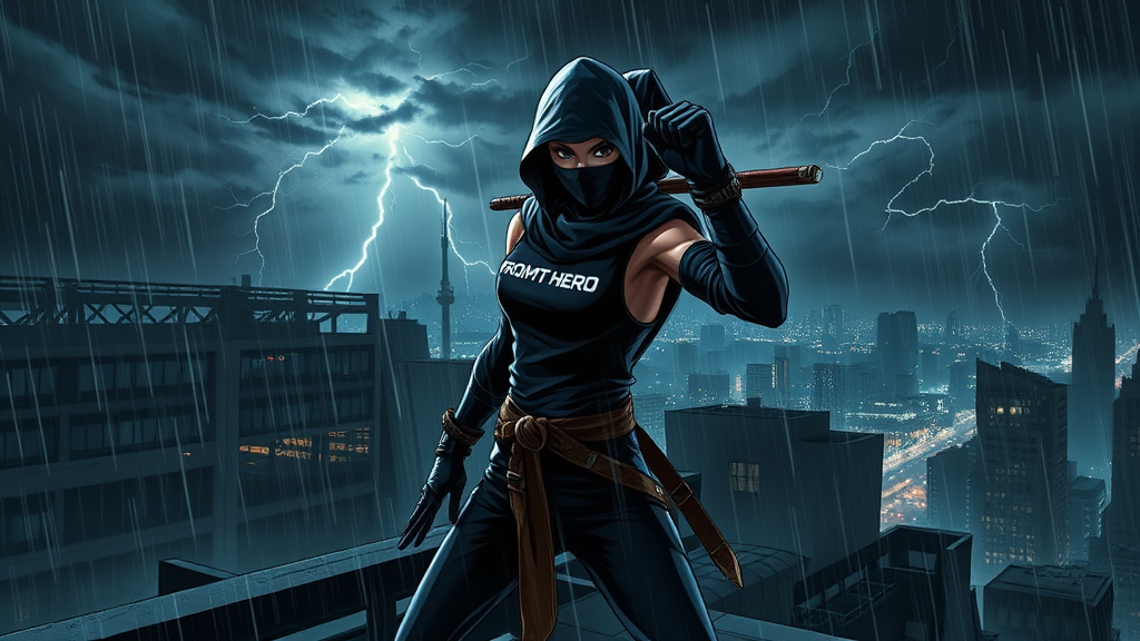 A digital artwork featuring a female ninja adorned with the Prompt Hero logo on her chest, poised on a rooftop overlooking a bleak and dystopian cityscape. She strikes a dynamic, fierce pose, her figure exuding power and determination as shadows play across her form. Rendered in a vivid comics style, the scene is extremely intricate and detailed, with an air of tension heightened by ominous and dramatic lighting. The setting is a dark, stormy night, with flashes of distant lightning illuminating the clouds and casting long shadows. Captured in the style of a Hasselblad long exposure, the image conveys movement and intensity, with every raindrop and detail meticulously portrayed.