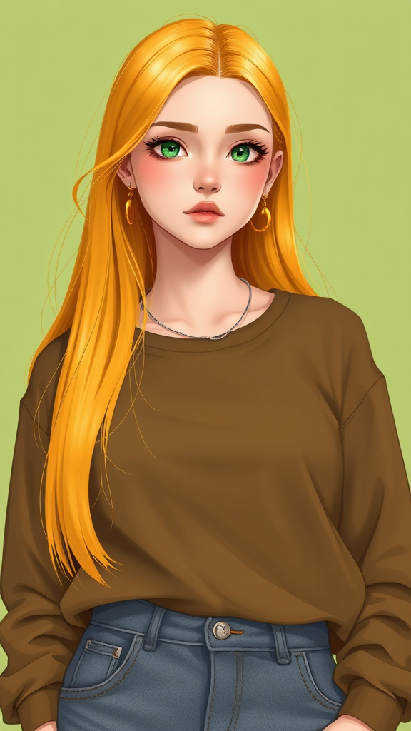 A digital artwork illustration of a 20-year-old girl, focusing on her upper body. She has long, straight, sunburst yellow hair and dark emerald green eyes. The background is a soothing almond green. She's wearing a dark banana yellow shirt paired with simple design jeans. Her look is completed with golden earrings and a silver simple necklace. Despite appearing slightly embarrassed, she exudes a mature confidence, carrying a bit of extra weight gracefully. The design is clean, capturing a beautiful, highly detailed character portrait. The overall aesthetic evokes a trending piece on Artstation, rendered in 8k resolution.