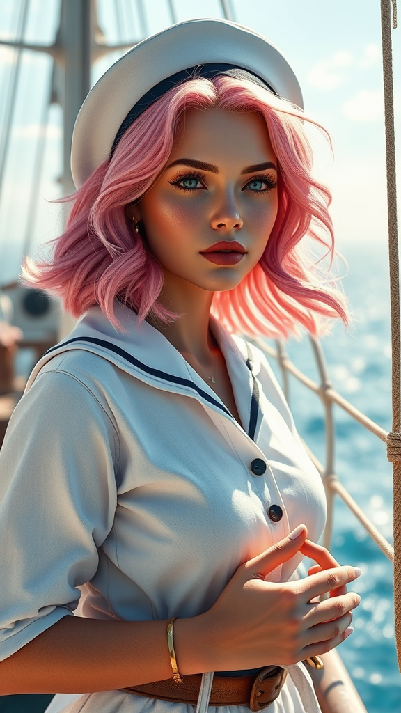 A digital artwork of a female sailor aboard a ship savoring the refreshing sea breeze, her medium wavy pink hair catching the sunlight, evoking the style of Terese Nielsen. The setting is sunny with a volumetric atmosphere, showcasing exceptional quality, sharp focus, and a stunning face. Her hands are elegantly posed, contributing to the high-resolution, vibrant scene. The artwork is intricately detailed, with breathtaking precision and comprehensive cinematic elements, capturing maximum detail in 4k UHD. The scene feels like an award-winning piece, reflecting the trend on ArtStation.