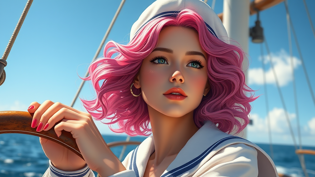A digital artwork of a female sailor aboard a ship, relishing the seabreeze with medium wavy pink hair. The scene is set under a bright sunny sky, with a focus on volumetric atmosphere and exceptional quality. Her face is beautiful, and her hands are delicately drawn, with every feature in sharp focus. The piece boasts vibrant colors, intricate and highly detailed elements, creating a breathtaking image with precise linework. The comprehensive cinematic style ensures maximum detail, rendering it in stunning 4k UHD. The artwork is inspired by Terese Nielsen's style, maintaining the core essence while adding a touch of originality. Every element is skillfully crafted, capturing a moment of serene beauty as she enjoys her nautical journey.
