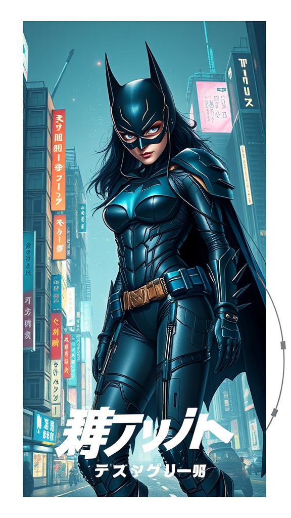 A digital artwork poster featuring Batgirl in a cyberpunk Tokyo setting, showcasing deconstructivism and dystopian art styles inspired by Maciej Kuciara's work on CGSociety and Behance, with darksynth elements. The composition includes a large white border and Japanese typography, enhancing the futuristic urban landscape with neon lights and high-tech architecture, all presented in HD quality. Creative modifications like subtle incorporations of traditional Japanese motifs amidst the high-tech visuals bring an added layer of cultural depth to the scene.