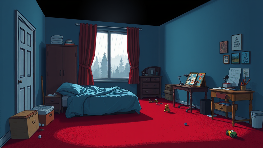 A digital cartoon art scene of a bedroom featuring red carpeting that extends throughout the room, with the walls painted in a faded blue and a contrasting black ceiling. The bed is tucked into the far corner, its blue duvet slightly rumpled. A large window situated next to the bed reveals a view of a rainy day, silhouetting the outlines of distant forests shrouded in mist. The room is dimly lit, enhancing the cozy gloom, accentuated by a scattering of toys on the floor and a half-open wardrobe close by. In the wardrobe, colorful clothes peek through. A small, vintage desk with art supplies and sketches is nestled against one of the faded blue walls, adding a touch of creativity and chaos to the messy room.