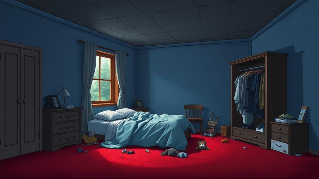 A digital cartoon depicting a dimly lit bedroom with a rich red carpet and walls painted in a soft, worn-out blue, contrasting against an elegant deep gray ceiling. Tucked into the corner is an unkempt bed covered by a cozy, ocean-colored duvet, flanked by a single window showcasing the gentle allure of a rain-soaked forest in the distance. The room is cluttered with a delightful ensemble of toys scattered across the floor, and a slightly ajar wardrobe brimming with clothes, its contents threatening to spill out. Central to the atmosphere is the play between shadows and soft light from raindrops tapping against the window, casting playful patterns across the disarray.