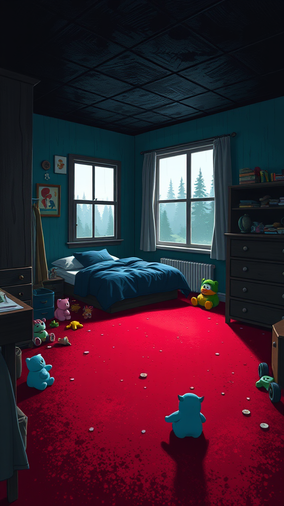 A digital cartoon depiction of a dimly lit bedroom featuring a vibrant red carpet and weathered teal walls, contrasting against a charcoal black ceiling. Tucked in the corner is a cozy bed dressed in a navy quilt, positioned beside a window revealing a drizzly day with the silhouettes of misty forests in the distance. The room is playfully cluttered with an array of colorful toys strewn about and a slightly ajar closet flanking the bed. Despite being dark, the scene captures a whimsical and chaotic charm.
