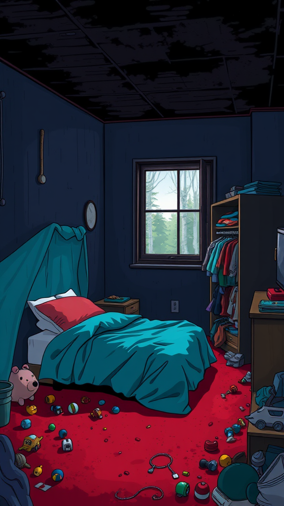 A digital cartoon-style illustration of a dimly lit bedroom with deep red carpeting, aged sky blue walls, and a charcoal black ceiling. In the corner stands a bed draped with a teal duvet, its pillow leaning toward a window that offers a glimpse of rain-soaked forests outside. The room is cluttered with an assortment of toys strewn across the floor and a partially open wardrobe overflowing with colorful clothes, hinting at chaos. The atmosphere exudes a sense of coziness amidst the disarray, with a soft glow from the window contrasting the shadows.