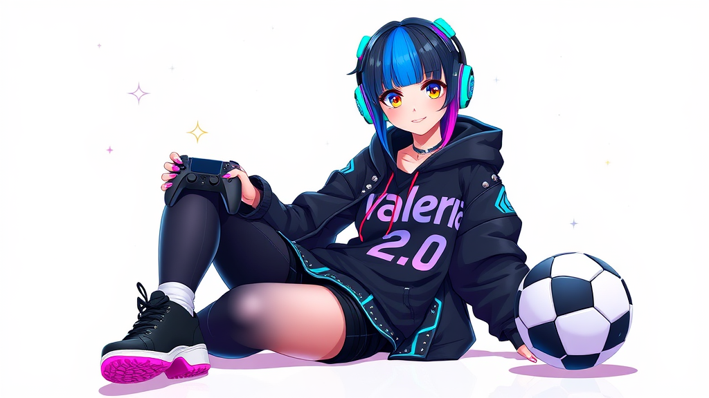 A digital character embodying a cyberpunk and kawaii aesthetic is dressed in black attire accentuated with neon blue and pink details. Adorned with a studded hoodie and a t-shirt displaying "Valeria 2.0," she wears eye-catching, bright blue gamer headphones and shimmering accessories. Her hair is styled in two tones, showcasing vibrant blue and pink streaks, and her eyes are a striking blend of honey brown with hints of green. Relaxed and content, she sits with one leg outstretched and the other bent, resting her elbow on her knee while holding a PS5 controller in one hand, a soccer ball by her side. A subtle smile graces her face as she sits against a minimalist, light-toned background sprinkled with floating stars and sparkles. Neon lights highlight her outfit, in a futuristic cyberpunk and kawaii style. The scene is completed with soft shadows, bright reflections, and high-definition digital realism, creating an engaging and immersive image.