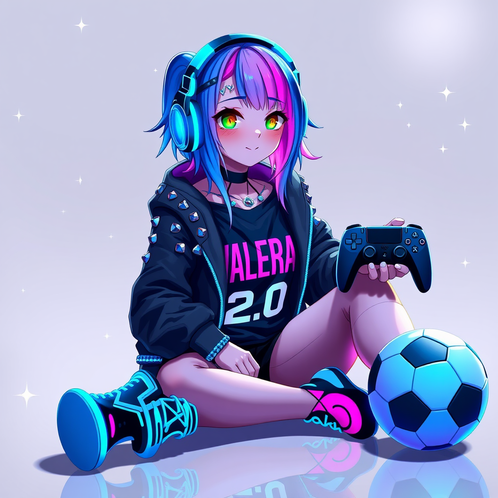 A digital character exuding a cyberpunk and kawaii aesthetic, dressed in black attire with neon blue and pink accents. She wears a hoodie adorned with studs and a t-shirt emblazoned with "Valeria 2.0". Her radiant blue gaming headphones and sparkling accessories catch the eye. Her hair is a striking mix of blue and pink, while her eyes are a captivating honey green-brown. Seated on the ground, she extends one leg while the other is bent, with an elbow resting on the knee, holding a PS5 controller in one hand and a soccer ball nearby. A slight, relaxed smile plays on her lips. The backdrop is a light minimalist setting, with glimmers and stars floating around. Neon lights accentuate her ensemble. The style is a fusion of futuristic, cyberpunk, and kawaii, with glowing neon, soft shading, and brilliant reflections, captured in digital realism, HD quality.