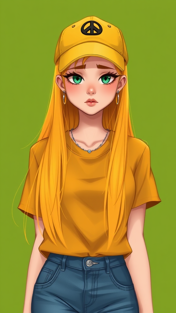 A digital character portrait of a 20-year-old woman with long, straight sunburst yellow hair and dark emerald green eyes against an almond green background. She wears a dark banana yellow shirt and jeans, complemented by golden earrings and a simple silver necklace. Her expression conveys subtle embarrassment, adding depth to her matured features. The artwork is beautifully illustrated, highly detailed, and rendered with exceptional skill. The design is simple yet striking, emphasizing her natural beauty. The portrait is a trendy piece on Artstation, capturing the essence of contemporary digital art. Additional creative touches include a peace symbol on a cap she wears, subtly blending with the scene, without unnecessary elements like extra limbs or distorted anatomy.